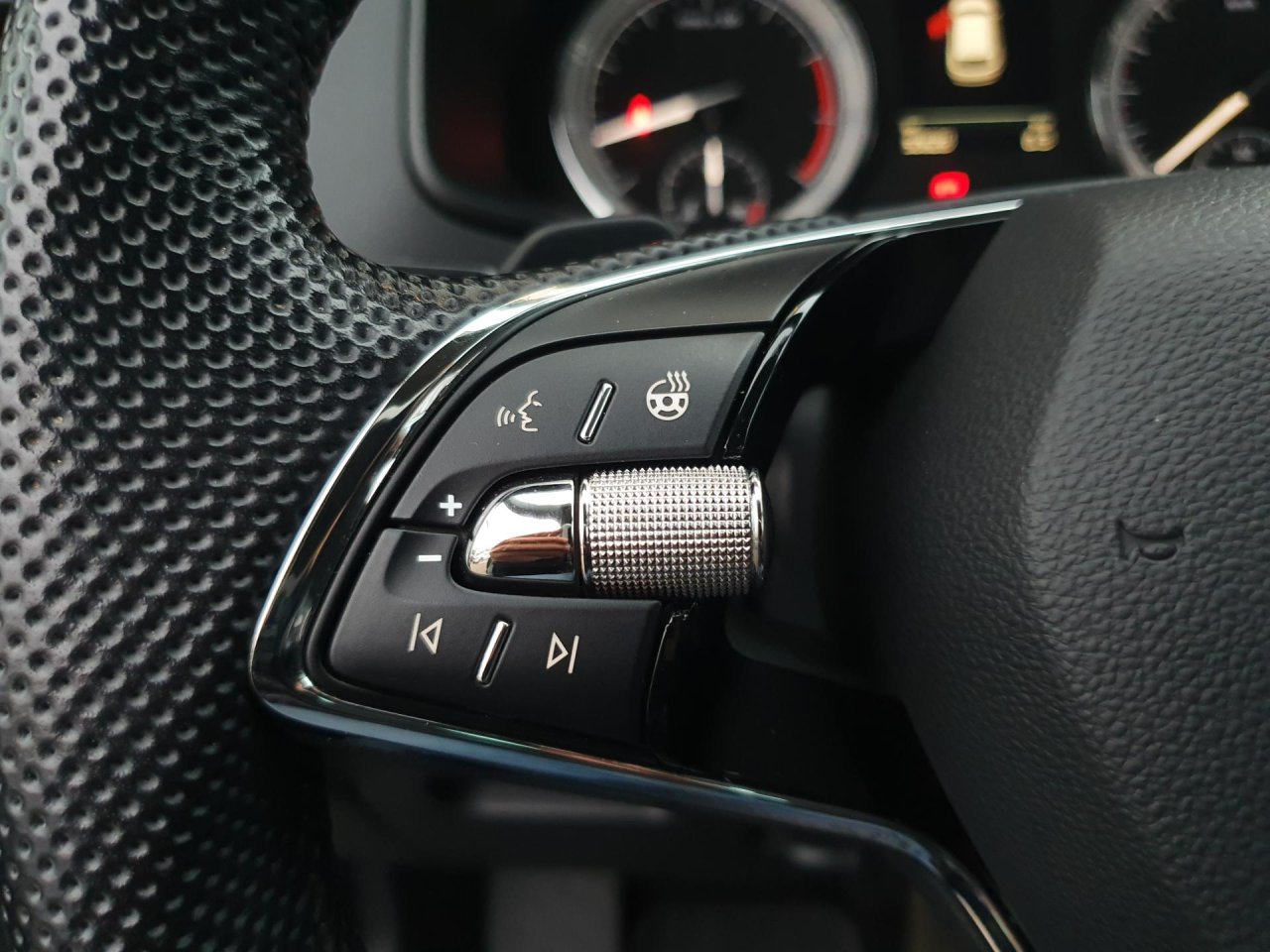 Trīsspieķu sporta, apsildāma daudzfunkcionāla ādas stūre ar radio/telefona vadību un pārnesumu pārslēgšanas lāpstiņām